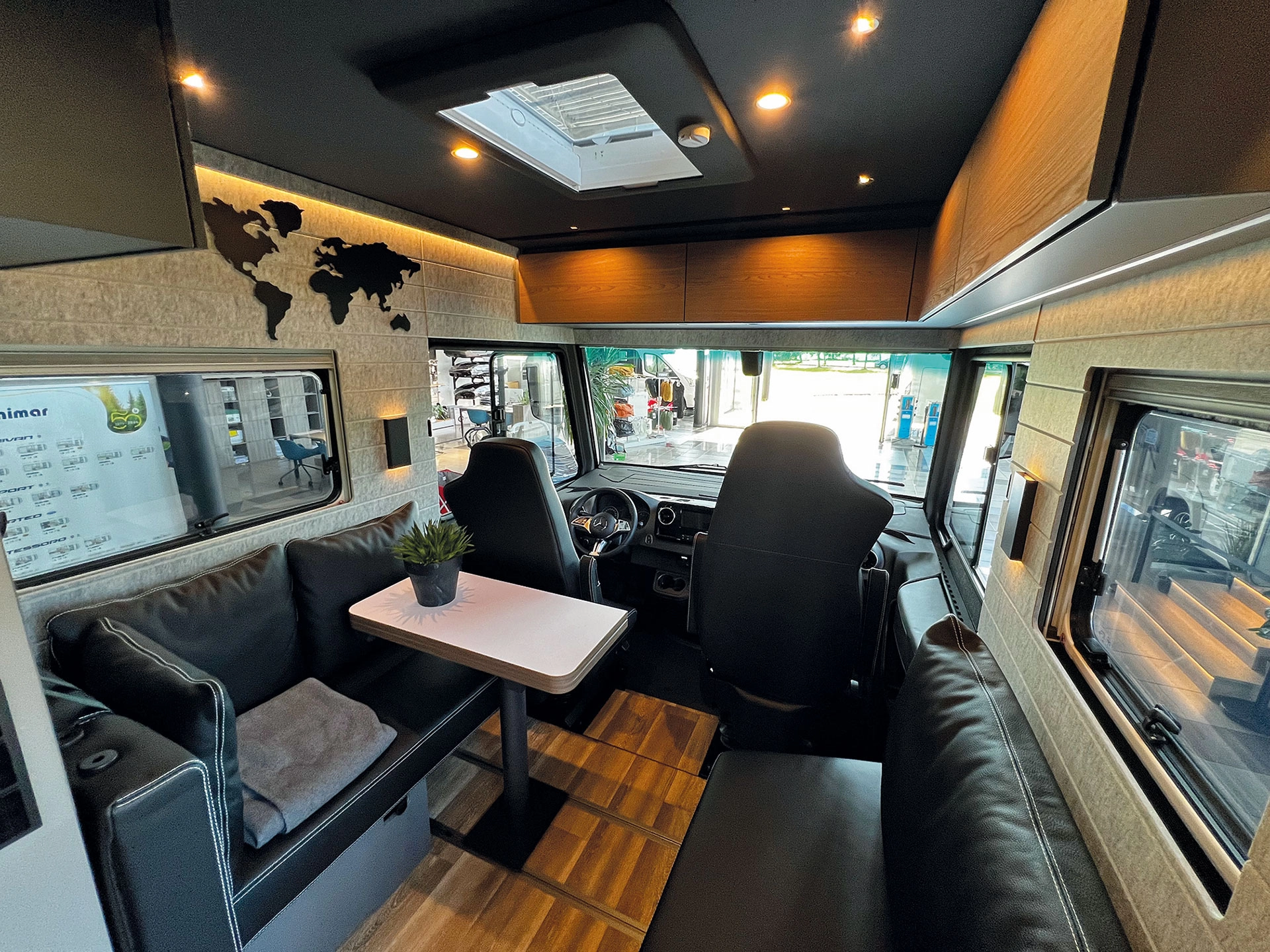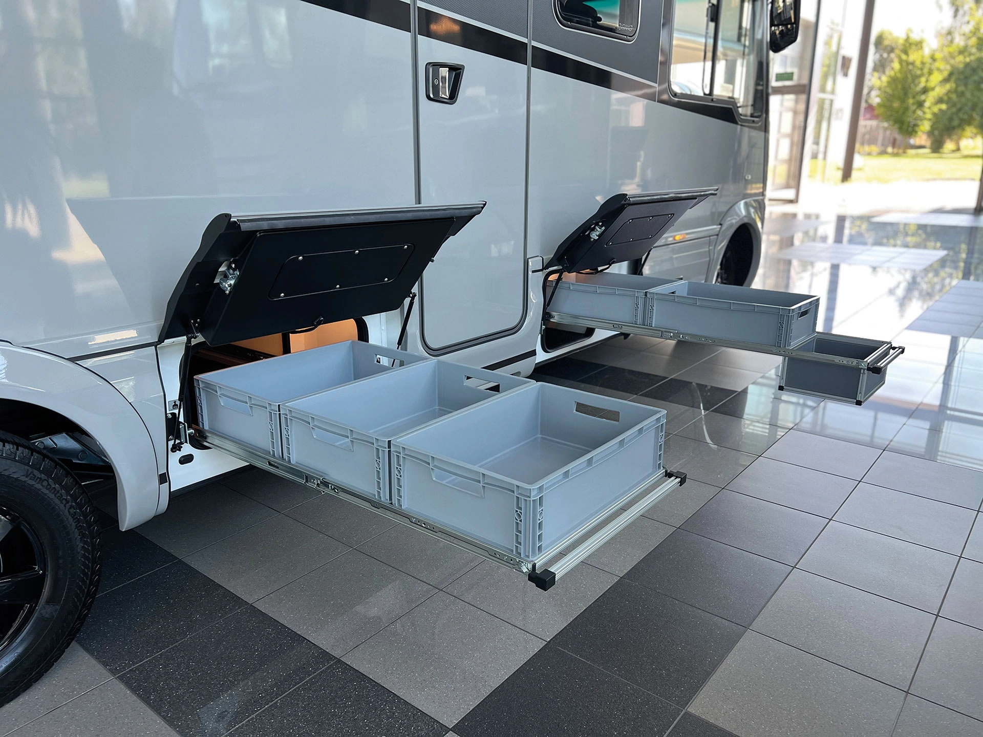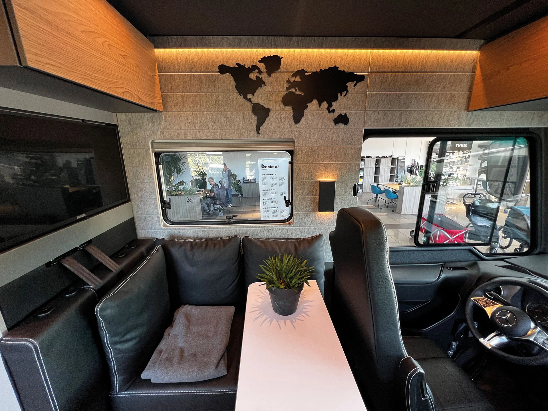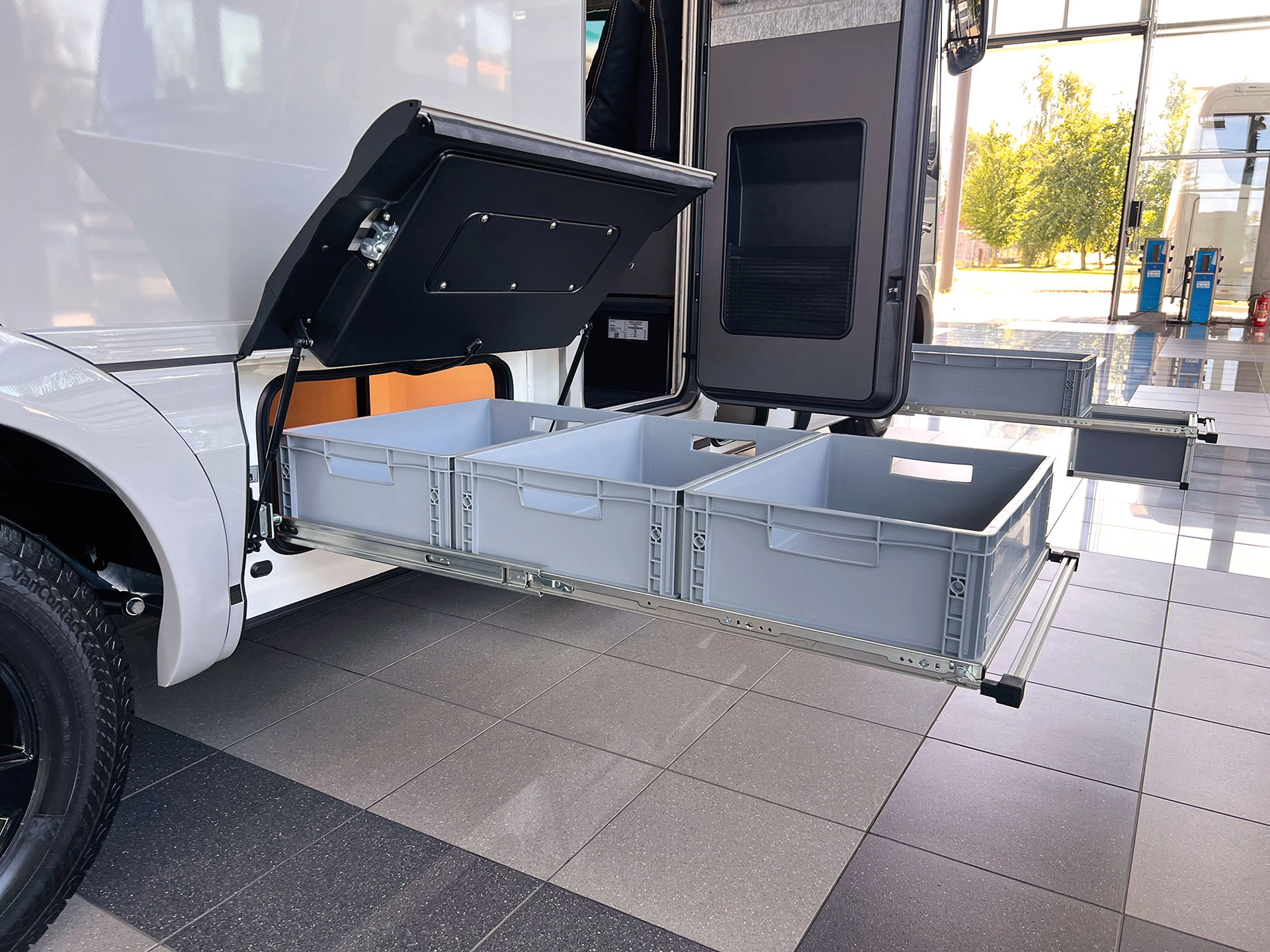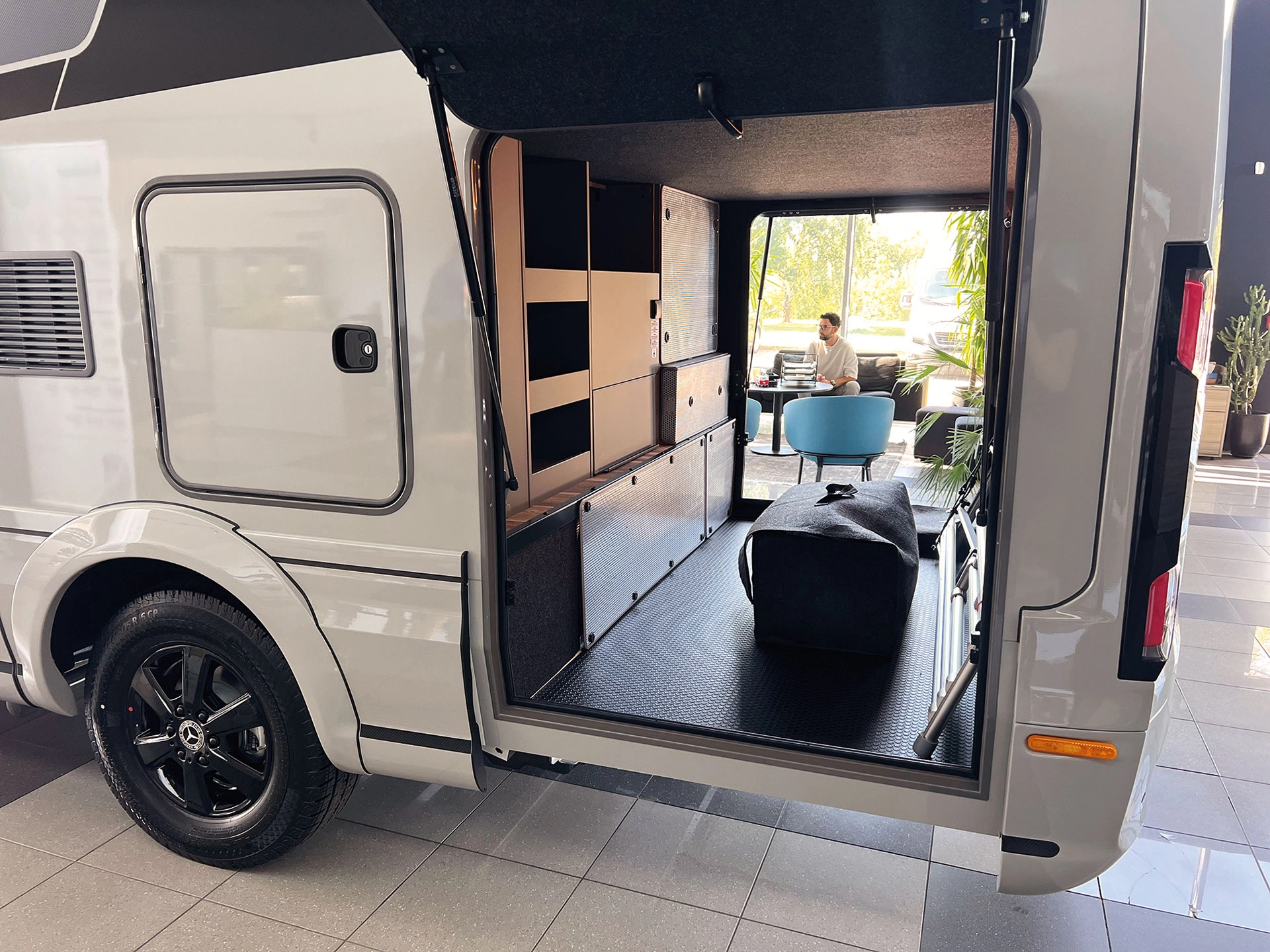 Nie ma jednego, niezmiennego układu urządzeń i szaf wewnątrz. Na przykład tam gdzie spodziewalibyśmy się szafy na płaszcze i balowe suknie, można zainstalować lodówkę lub ścianę z szufladami. Podobnych możliwości jest więcej. W samej sypialni znajdziemy przykład dobrego wzornictwa przemysłowego, przyglądając się podnoszonym wraz z podłożem materacy podłużnicom na wieszaki do ubrań, a w każdym z możliwych miejsc znajdziemy szafki lub szuflady wykorzystujące maksymalnie dostępne miejsce do przechowywania. Duża jaskółka nad miejscami pasażerskimi dodaje jeszcze kolorytu.