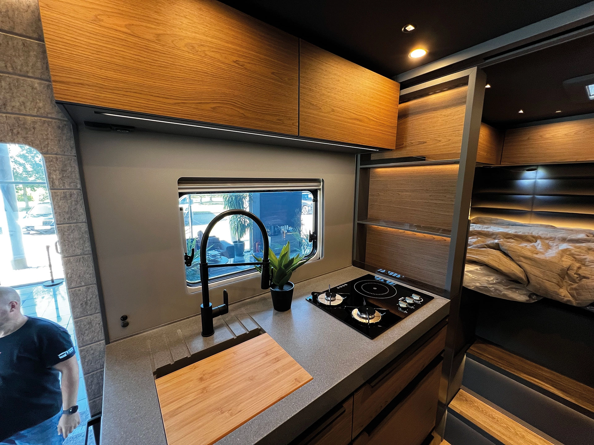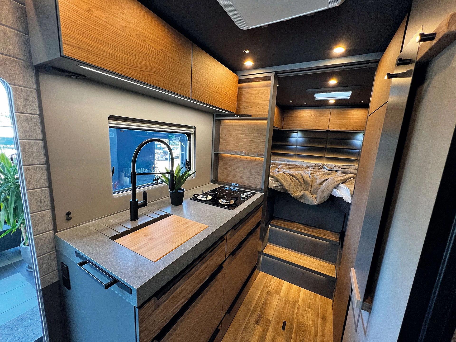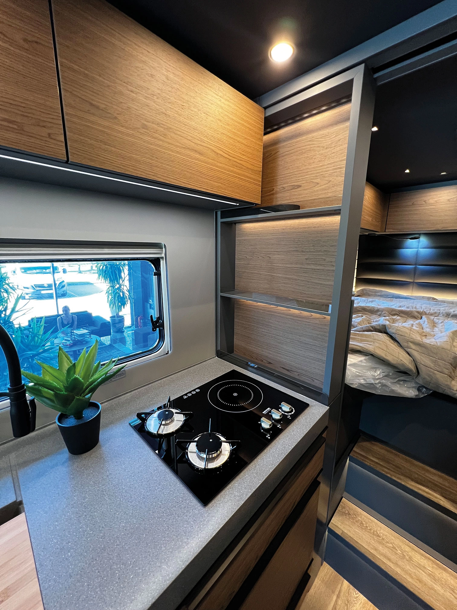 Kuchnia to w wielu domach centrum życia, w Arto 78 usytuowano ją również tak, aby z każdego punktu kampera było do niej najbliżej. Centralnie. Zawiera kuchenkę typu hybrydowego z dwoma palnikami gazowymi i płytą indukcyjną, ekspres kapsułkowy czy wysuwaną deskę do krojenia. W zależności od konfiguracji szafki kuchennej wybranej przez klienta może być też wyposażona w zmywarkę, piekarnik, lodówkę szufladową lub indywidualny układ szuflad cargo. Ciekawym rozwiązaniem jest elektrycznie podnoszona półka kuchenna na przyrządy do gotowania, które można po wykorzystaniu schować przed widokiem.