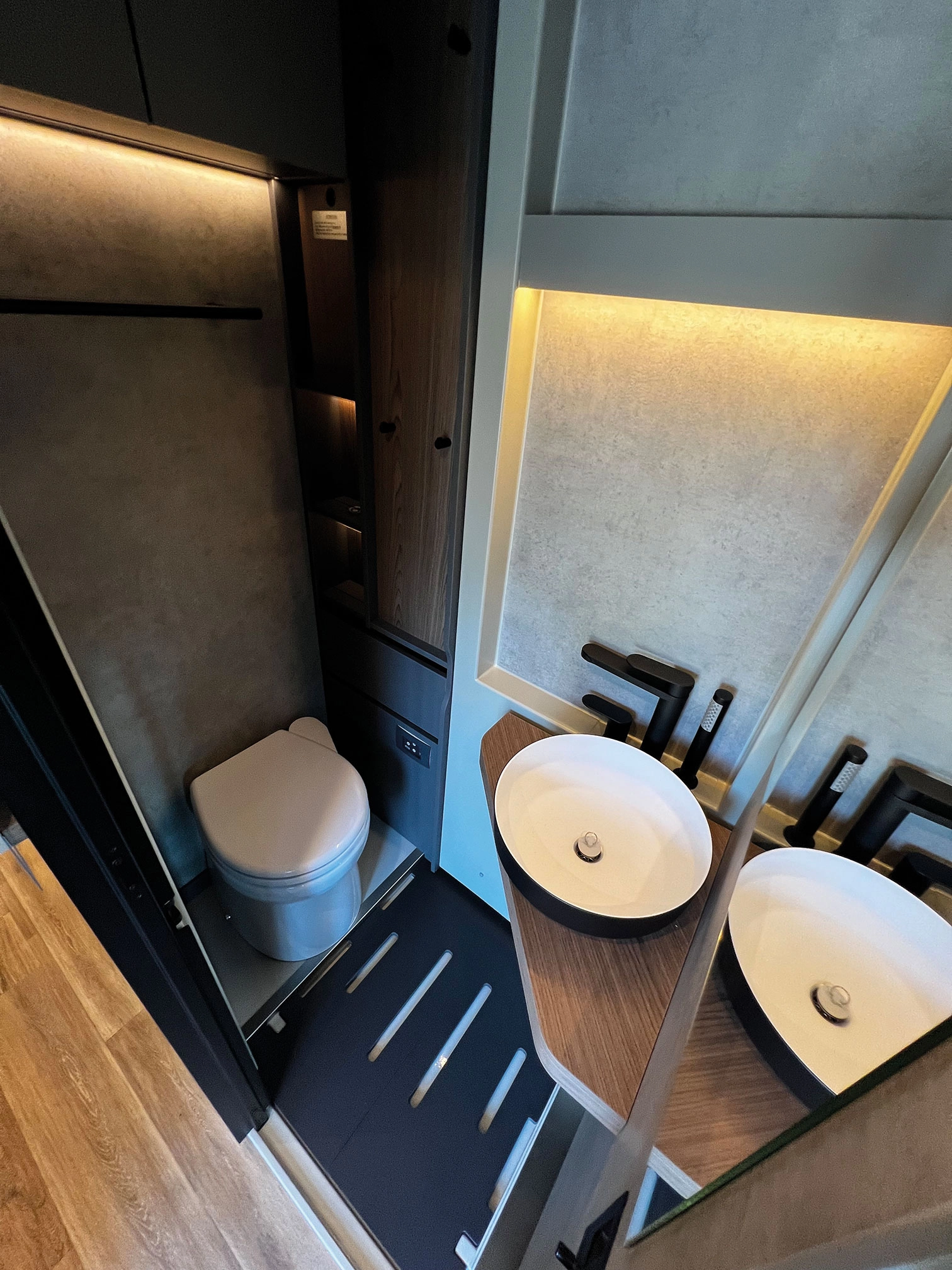 Łazienka, toaleta, prysznic – tutaj lekkie zaskoczenie, ponieważ nie ma niezależnego prysznica. Znajduje się za odchylaną ścianą. To rozwiązanie znane z mniejszych kamperów, jednak w przypadku Arto 78 dopracowane do perfekcji. Jak opisuje je producent, szczelność i zabezpieczenia przed przedostawaniem się wilgoci w niechciane miejsca gwarantowane w 100%.