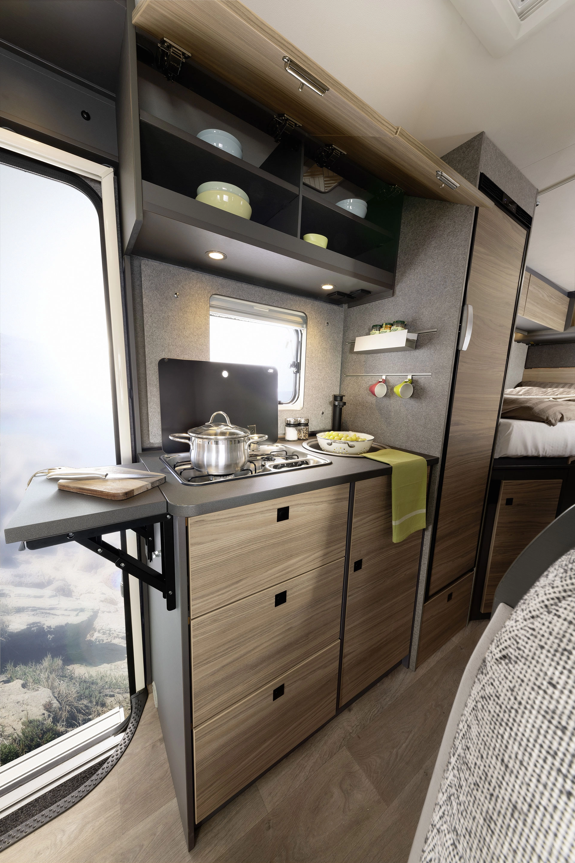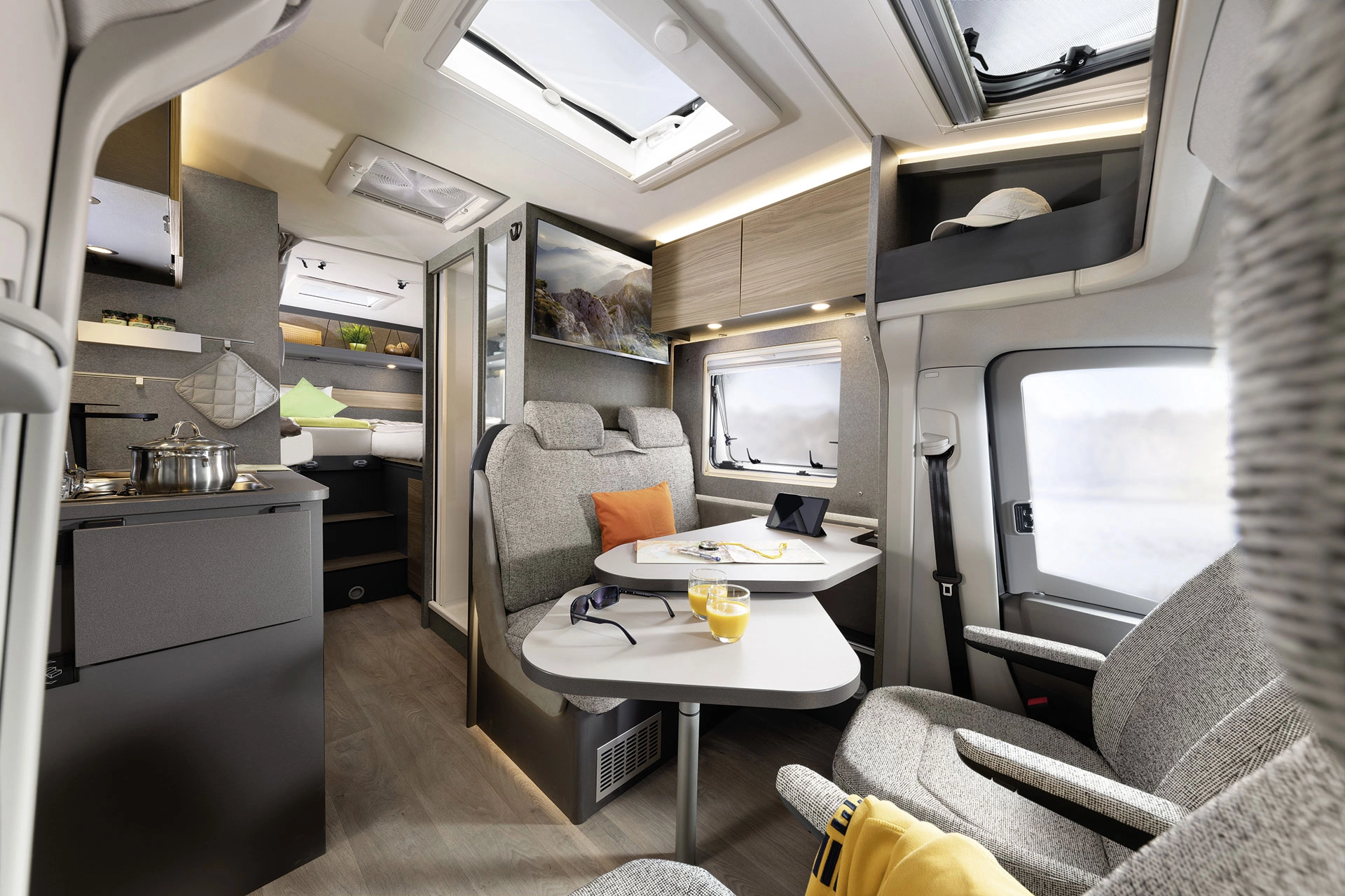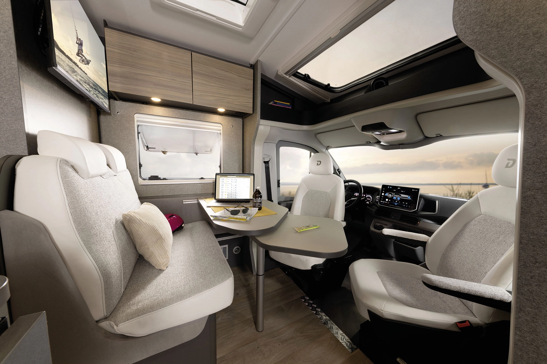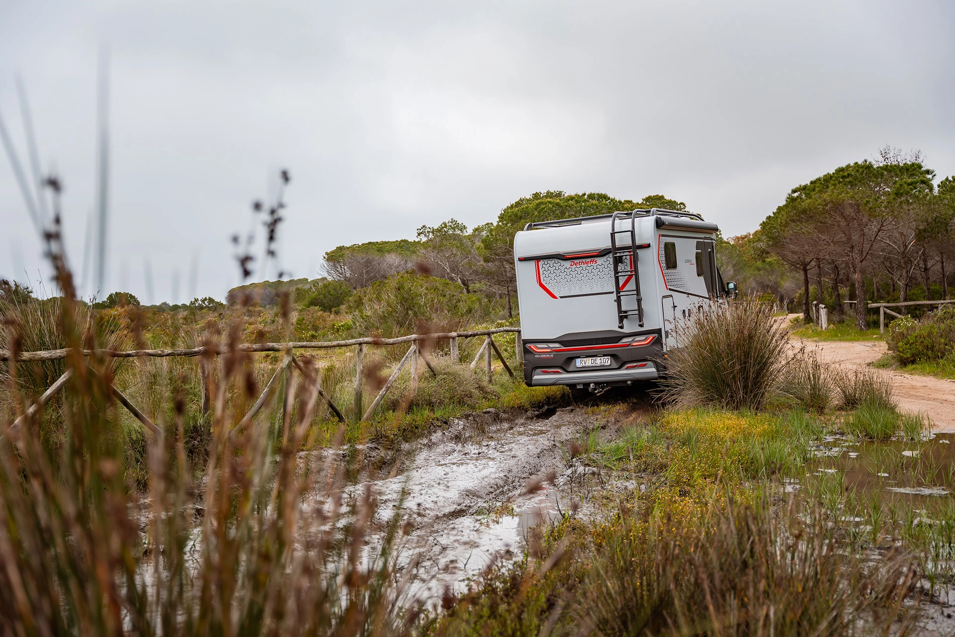 Wyrazisty design pojazdu wyróżnia się kabiną w odcieniu Compovolo Grey, ekskluzywnymi naklejkami i czerwonym logo Dethleffs. Terenowy charakter podkreślają 18-calowe opony off-road na czarnych felgach, czarny zderzak, LED-owa listwa, boczne progi, markiza, drabina i relingi dachowe – wszystko w czarnej kolorystyce. Wnętrze kampera zapewnia komfort apartamentu na kółkach. Przestronna kabina (685 cm długości, 220 cm szerokości) z szerokimi drzwiami i wysuwanym stopniem to układ dla dwóch osób: półjadalnia z przodu, dwa oddzielne łóżka z tyłu, ergonomiczna kuchnia i modułowa łazienka z obrotową ścianą, zamienianą w prysznic. Liczne schowki pozwalają na wygodne przechowywanie bagażu.