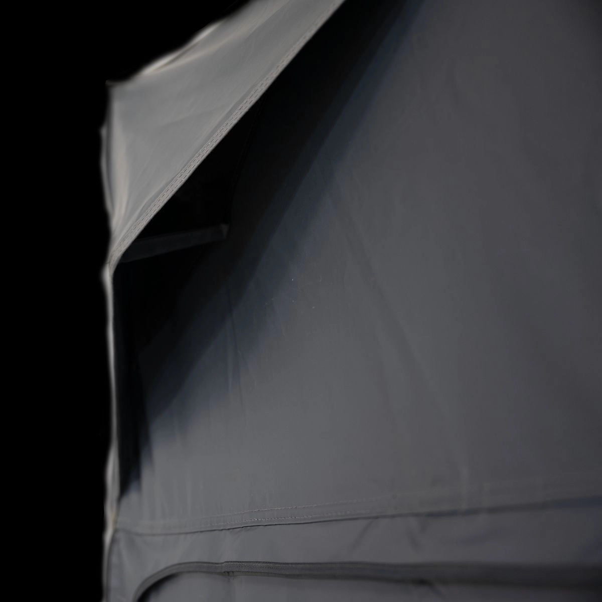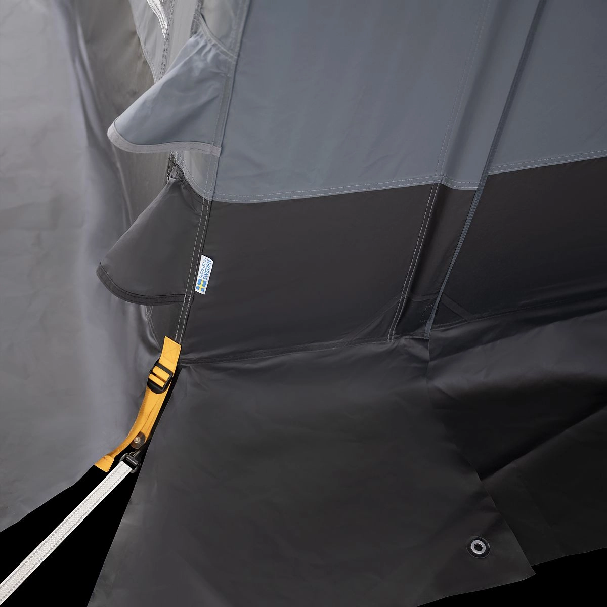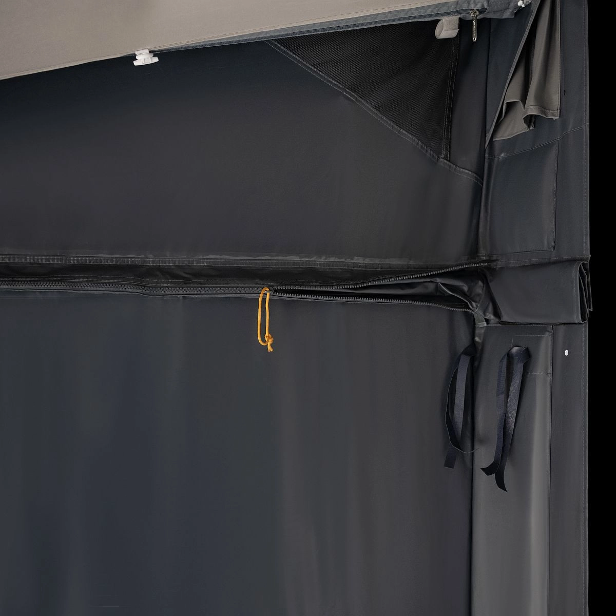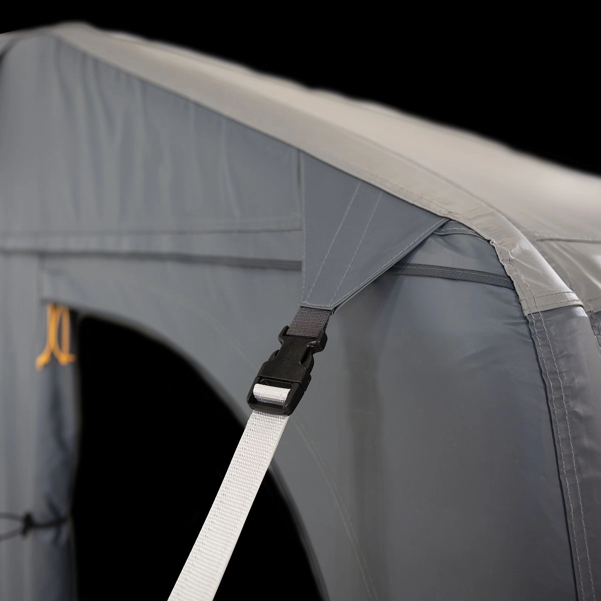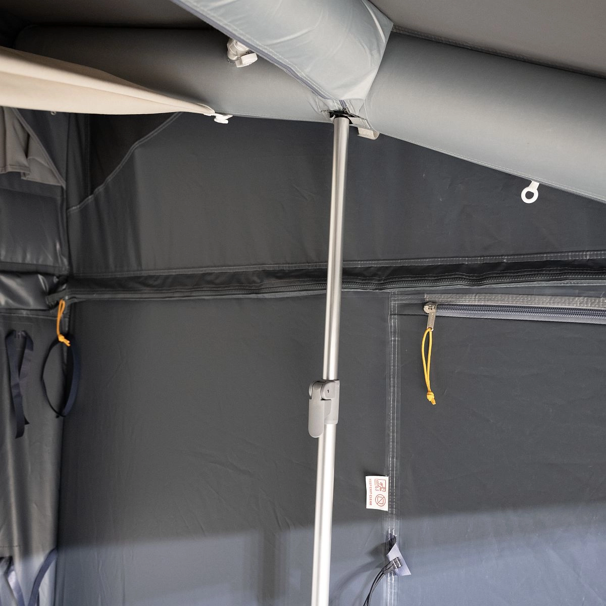 Przedsionek opiera się na pompowanym stelażu AIRFrame, więc rozstawienie jest proste i szybkie. W zestawie znajdują się słupki podporowe i zimowe stabilizatory dachu, a sam dach ma duży spadek po to, aby przy intensywnych opadach śniegu mógł się on swobodnie zsuwać. Do tego dostajemy duże przednie drzwi – szerokie przednie wejście, rolowane na bok dla łatwego dostępu. Ważny element konstrukcji to wentylacja Apex, która bardzo skutecznie pomaga odprowadzać wilgoć, co potwierdza praktyka.