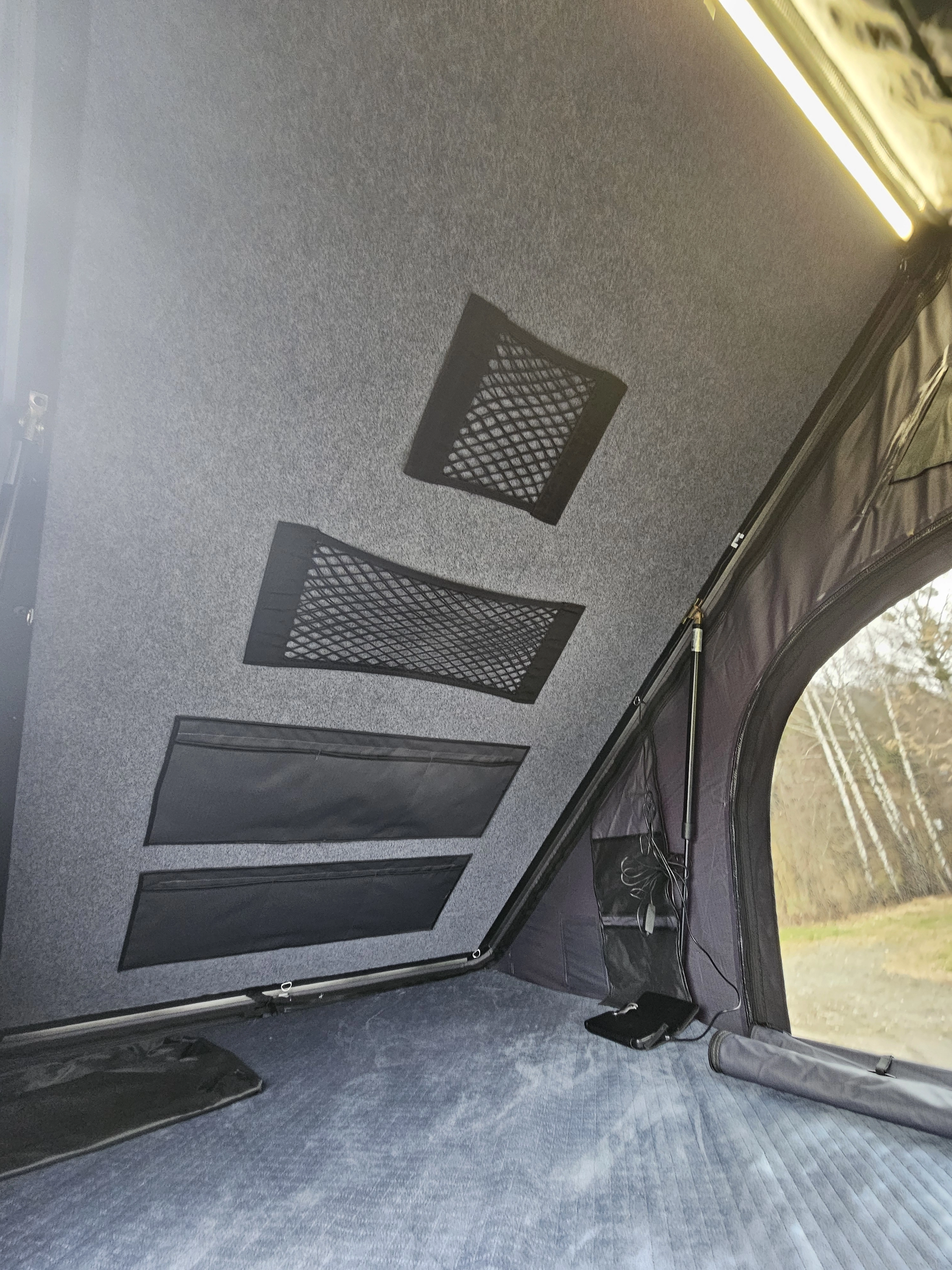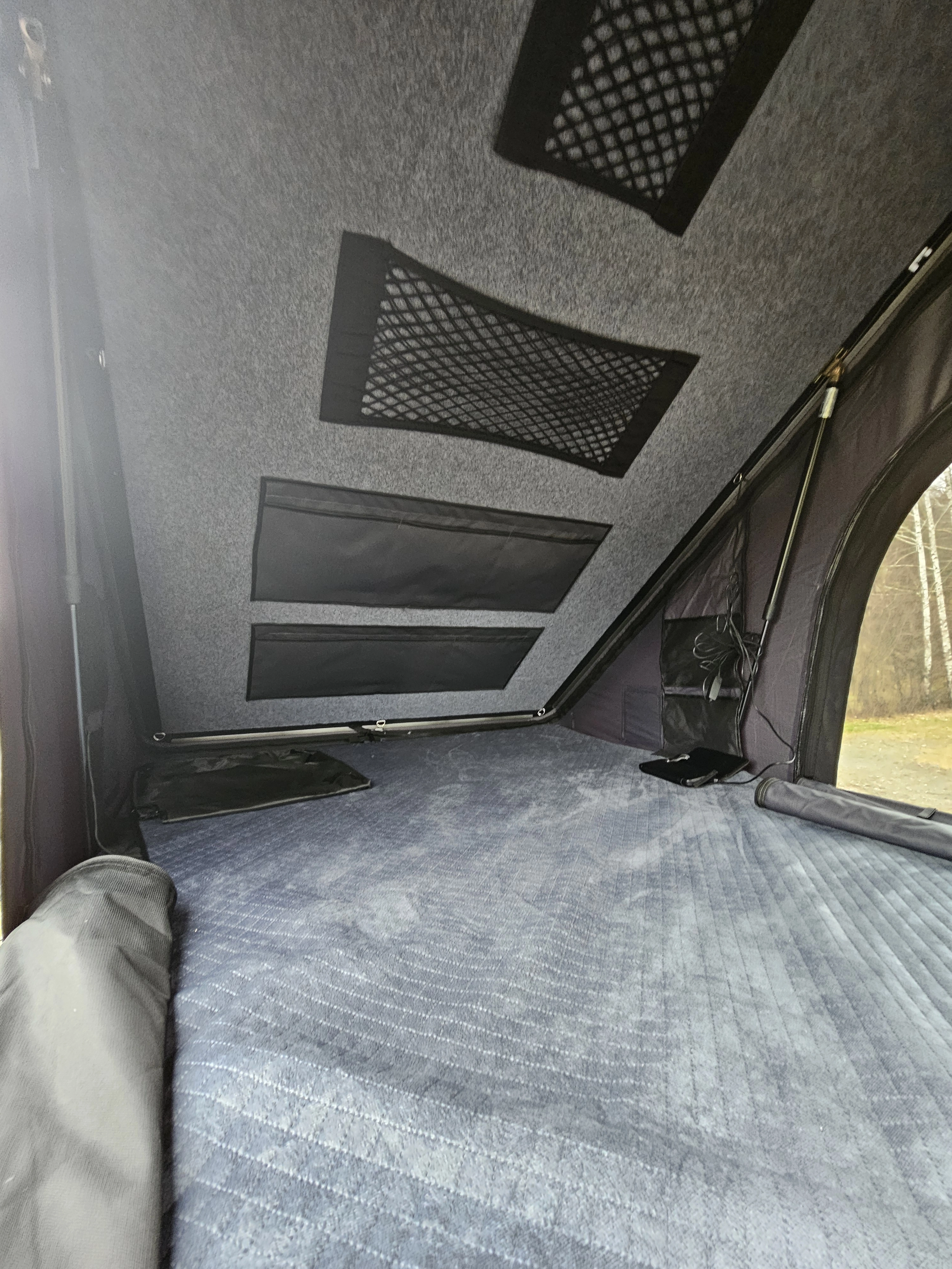Wewnętrzna część pokrywy pokryta jest miękką wykładziną samochodową, do której można mocować na rzepach różne akcesoria, takie jak torby, kieszenie, oświetlenie, powerbanki, itp. W zestawie znajdują się dwie siatki bagażowe, oraz dwie duże kieszenie. Z jednej strony posiadają one rzep, dlatego możesz zmieniać ich układ wedle uznania. Jest także stałe oświetlenie LED z regulacją natężenia światła. Wystarczy podłączyć źródło zasilania 5V poprzez złącze USB czyli np. powerbank. Filc samochodowy to materiał trwały, który nie odbarwia się, dobrze oddycha, nie jest szkodliwy dla środowiska oraz nie uczula.