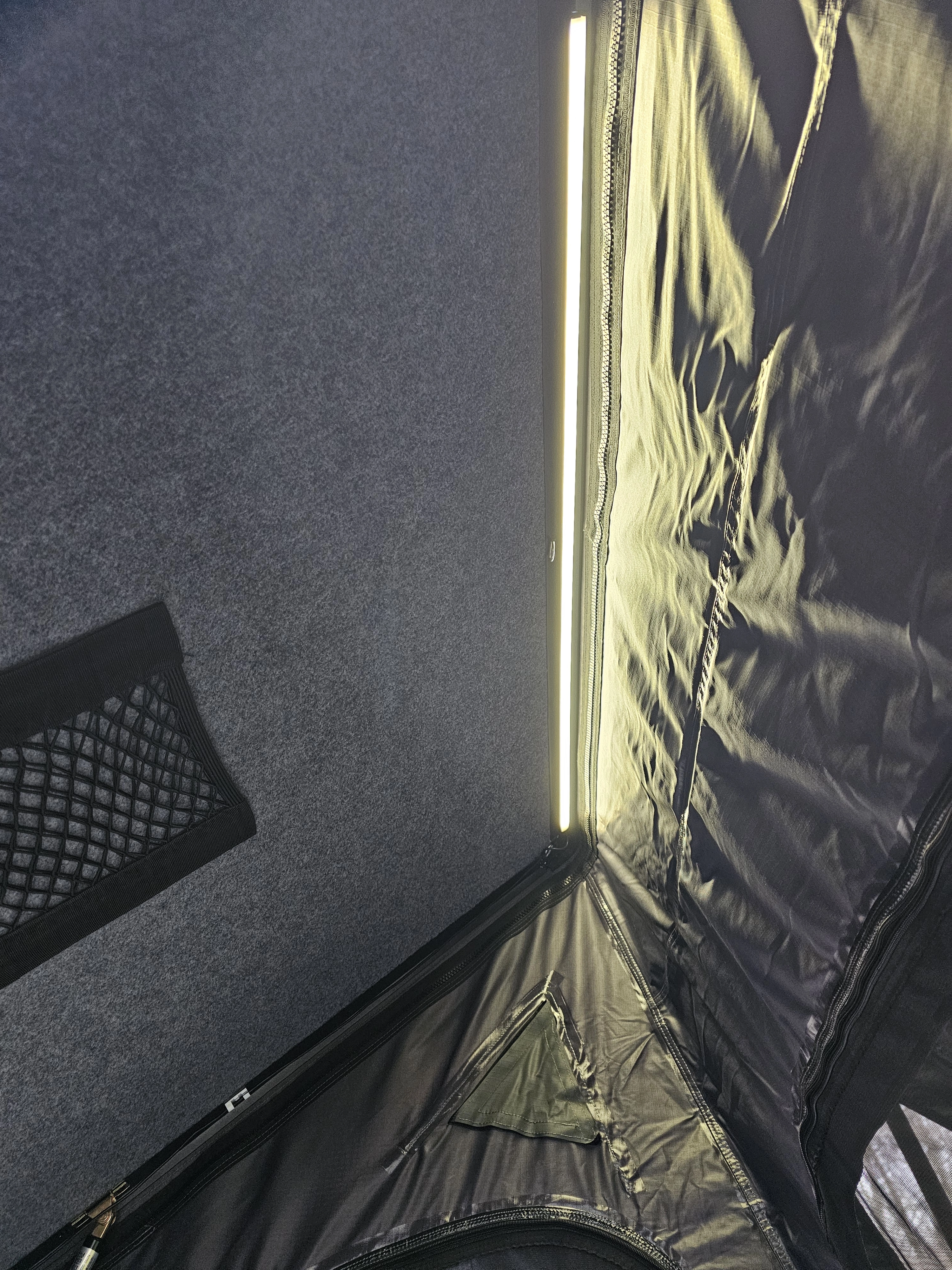 W trosce o wygodę i porządek, do namiotu dołączone są dwie torby, w których schowamy buty czy inne niezbędne przedmioty. W środku namiotu, w jego górnej części, znajduje się pasek LEDowy, który uruchamia się podłączając do niego powerbank. Pozwala on na oświetlenie wnętrza i ułatwia poruszanie się w nim po zachodzie słońca. Pasek LEDowy zużywa bardzo mało energii. Do namiotu dołączona jest także składana aluminiowa drabinka. Jest lekka, poręczna i nie zajmuje dużo miejsca.