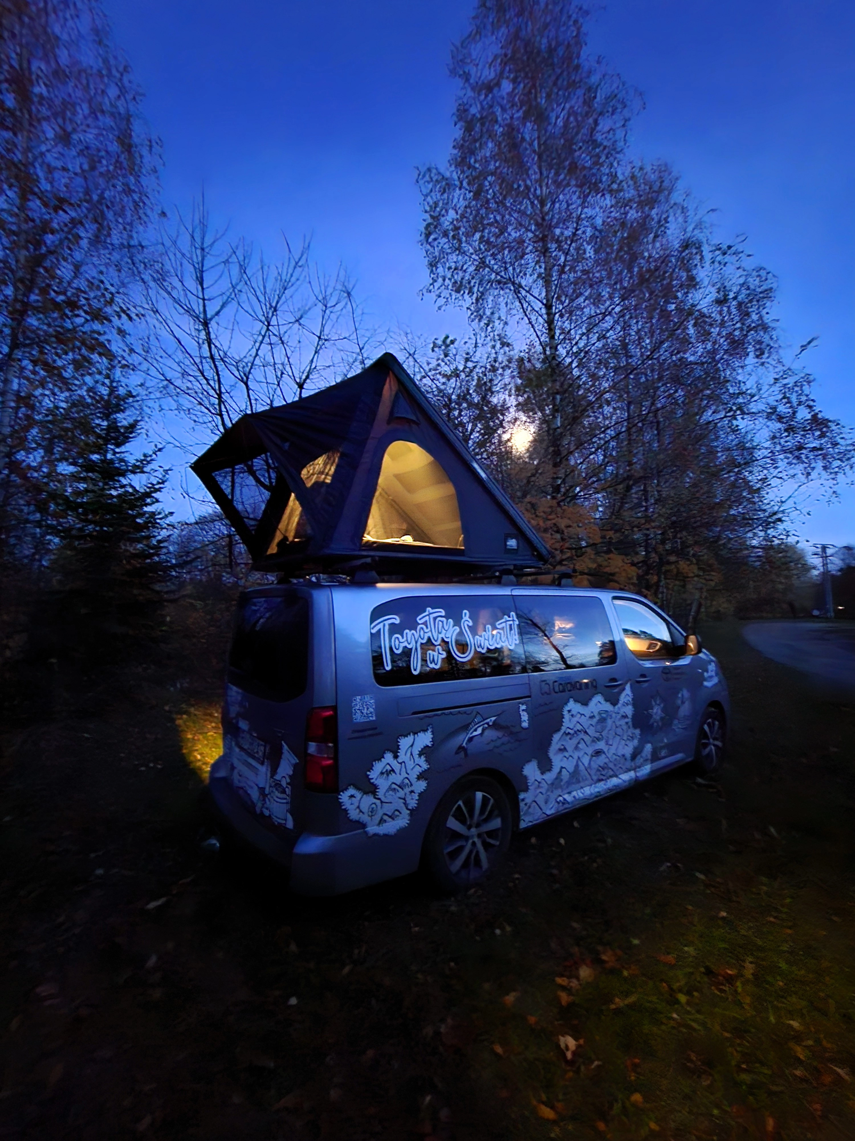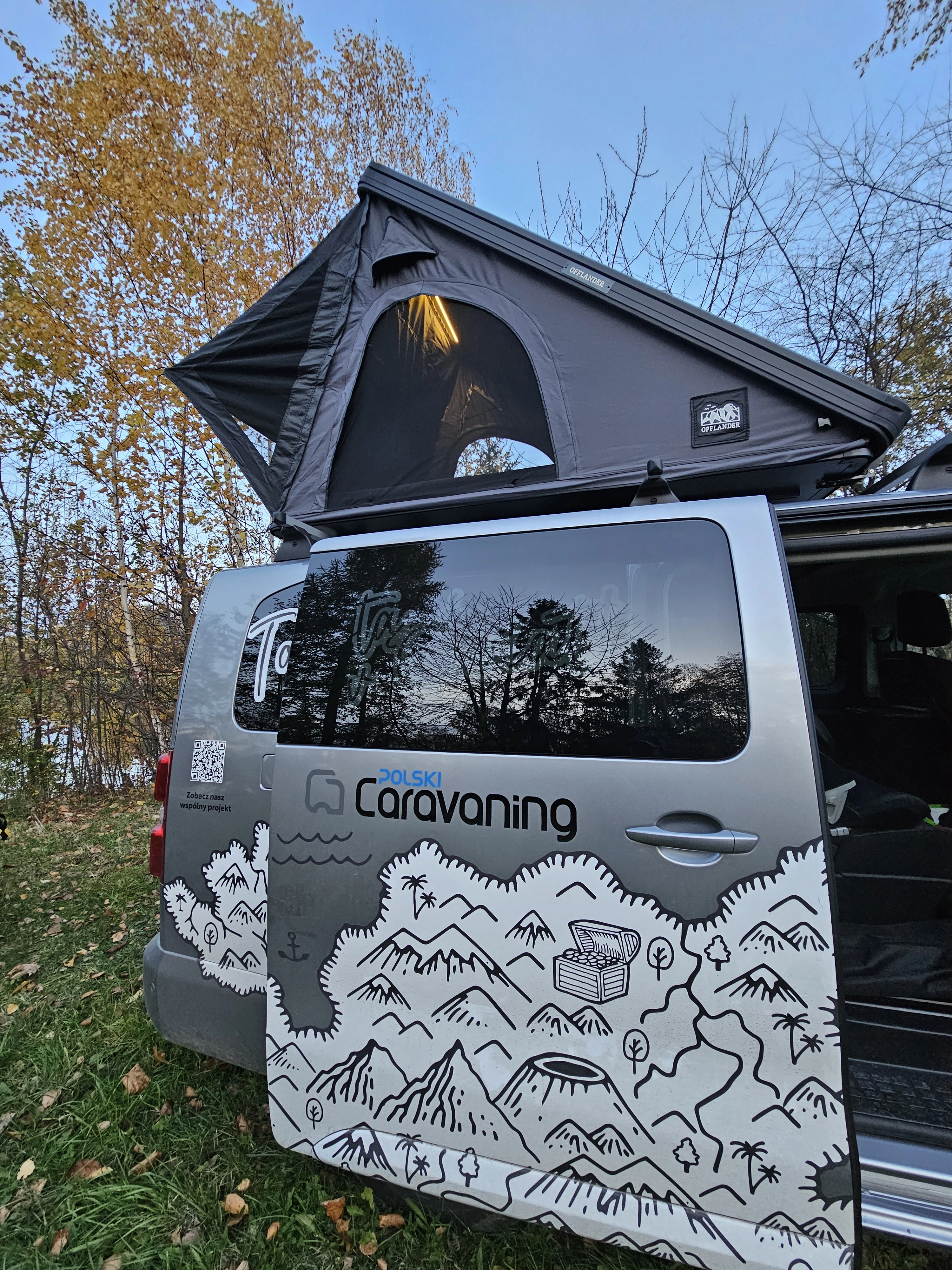 Jednym z elementów wyposażenia dodatkowego naszej Toyota Proace Verso Long jest namiot dachowy Triangle Slim marki Offlander. Kluczowe cechy produktu to prostota, minimalizm i błyskawiczne rozkładanie. Niezwykle niski profil po złożeniu (zaledwie 13 cm wysokości) czyni go jednym z najbardziej aerodynamicznych namiotów na rynku, idealnym do codziennego użytkowania. Wyobraź sobie: dojeżdżasz na biwak późnym wieczorem, jesteś zmęczony po całym dniu podróży. Ciemno, pada. Zamiast rozstawiać klasyczny namiot, odpinasz dwa zatrzaski, unosisz pokrywę i po kilku sekundach otrzymujesz gotowe miejsce do spania. Bez szarpania się ze stelażami i bez nerwów.