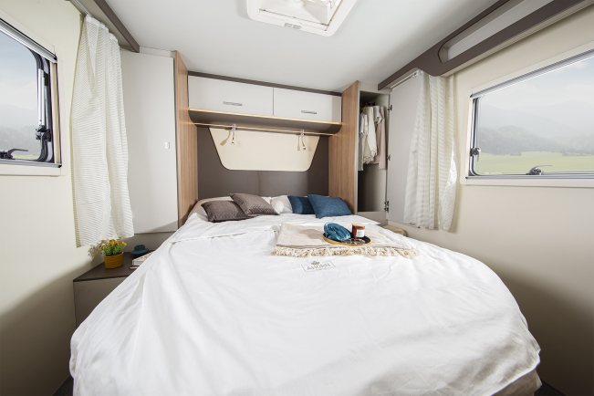 Alaska TQ oferuje wyjątkowe wrażenia podczas snu. Z dużym łóżkiem typu queen-size możecie dosłownie spać jak królowie. Przestrzeń przy łóżku jest przeznaczona na schowek oraz na dwie duże szafy pionowe. Buty i nieporęczne przedmioty z salonu mogą zniknąć pod łóżkiem. Ściemniane światła LED i duże okna ramowe zapewniają zawsze przyjemną atmosferę świetlną.