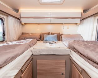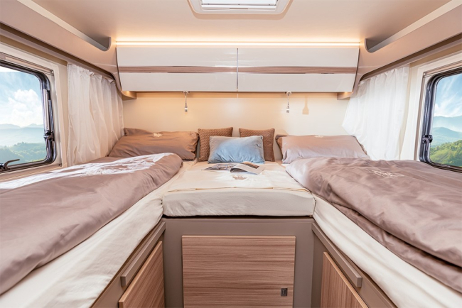 Mając mniej niż siedem metrów, ACT 660 oferuje wszystko, czego dusza kampera zapragnie. Przytulną 4-osobową jadalnię można w kilku prostych krokach przekształcić w podwójne łóżko. Przyciemniane elementy LED zapewniają przyjemną, miłą atmosferę. Francuskie podwójne łóżko kompaktowego półzintegrowanego kampera pozwala na optymalny rozkład pomieszczenia, dzięki czemu pozostaje wystarczająco dużo miejsca na w pełni wyposażoną kuchnię z 3-palnikową płytą grzejną. Wyłazy dachowe i opcjonalny okap dachowy zalewają pomieszczenie światłem dziennym.