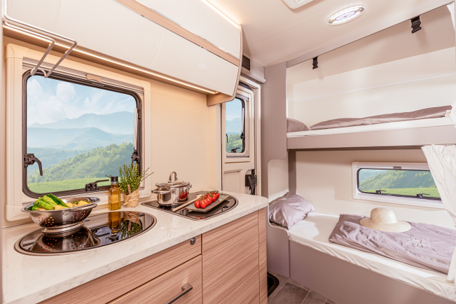 Nasz model alkowy z łóżkami piętrowymi oferuje miejsce dla każdego – rodziny z gromadką dzieci lub całej grupy przyjaciół. Z maksymalnie siedmioma miejscami do spania, optymalnym układem pomieszczeń i przestronną koncepcją projektową, Canada AS nigdy nie jest ciasna. Tylko dwa łóżka piętrowe w tylnej części są statyczne. Podwójne łóżko w alkowie jest składane w ciągu dnia, podwójne i pojedyncze łóżko w jadalni ustępują miejsca dwóm siedziskom. Cofnięte drzwi wejściowe sprawiają, że salon jest jeszcze bardziej przytulny. Siatki zabezpieczające na łóżkach piętrowych i alkowie pozwalają beztrosko spać w nocy.