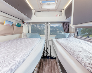 Wielokrotnie nagradzany Van 620 to idealny pojazd dla podróżnych, którzy chcą podróżować kompaktowo, a jednocześnie korzystać z szerokiej gamy wyposażenia. Wygodne łóżka wzdłużne z tyłu można połączyć wkładając dodatkowy element. Przydatne miejsce do przechowywania znajduje się pod łóżkami. Kącik jadalny z przodu można w kilku prostych krokach przekształcić w łóżko pojedyncze. Dzięki wielu szafkom i niskiej wadze podstawowej van oferuje wiele opcji transportu bagażu. W pełni wyposażona kuchnia oraz łazienka z toaletą i prysznicem umożliwiają samodzielną podróż we dwoje, małą rodzinę lub z przyjaciółmi. Chłodne napoje można również zabrać z zewnątrz z lodówki tuż przy wejściu.