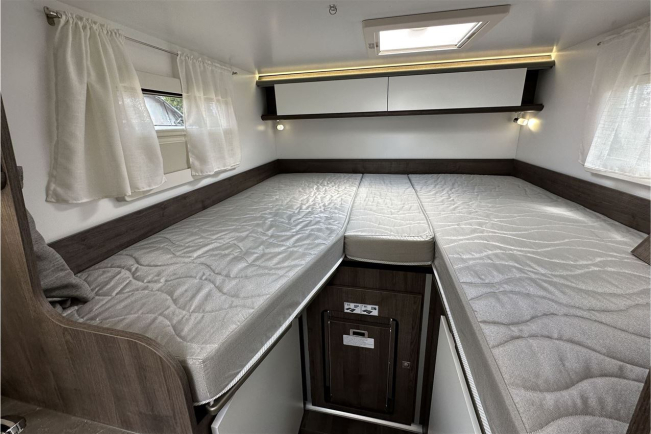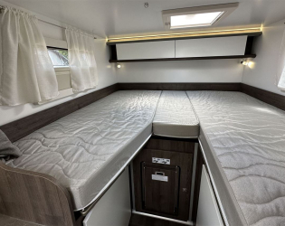- Okna dachowe z moskitierą i roletą zaciemniającą (71x105 cm) + Składane rolety + Siedzenia w kabinie kierowcy w tym samym kolorze co tapicerka w salonie + po 2 poduszki w salonie i sypialni + Drzwi wejściowe z elektrycznym 2-punktowym zamkiem, moskitierą, oknem i koszem na śmieci + Kamera cofania + Panel solarny 150 W + Światło LED nad wejściem