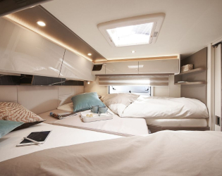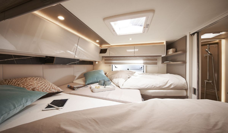 - Pośrednie oświetlenie pod szafkami górnymi w części wypoczynkowej po stronie kierowcy, kuchni i tylnym łóżku