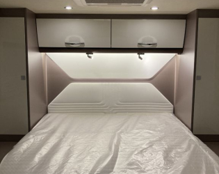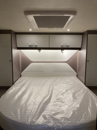 • Łóżko małżeńskie z regulacją wysokości, z dużym włazem do garażu po lewej stronie (W przypadku układów z łóżkiem małżeńskim drzwi garażowe możliwe są tylko w połączeniu z opcją „łóżko małżeńskie z ręczną regulacją wysokości”)