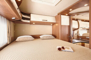 - Wygodny dostęp do wnętrza przez pokrycie siedziska w części wypoczynkowej w kształcie litery L i odchylana boczna kanapa (w zależności od modelu) oraz dużą klapę podłogową w części mieszkalnej