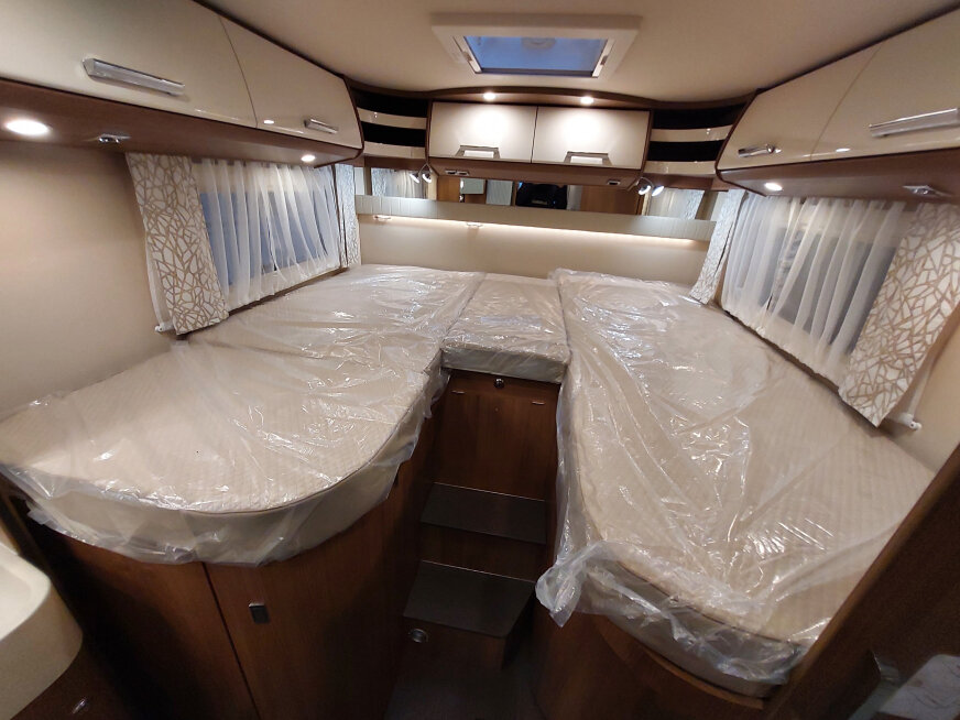 - Wygodny dostęp do wnętrza przez pokrycie siedziska w części wypoczynkowej w kształcie litery L i odchylana boczna kanapa (w zależności od modelu) oraz dużą klapę podłogową w części mieszkalnej