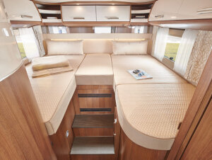 - Piąte siedzenie w bocznej kanapie z 3-punktowym pasem bezpieczeństwa (Podana liczba osób zależy od masy i nacisku na oś. Można ją zmniejszyć instalując dodatki i funkcje specjalne. Podana liczba dotyczy masy pojazdu w serii konfiguracji produkcyjnej i określa maksymalną liczbę osób, które mogą siedzieć podczas jazdy. W zależności od modelu można to osiągnąć tylko poprzez zwiększenie masy. Nie wolno przekraczać technicznie dopuszczalnej masy całkowitej i nośności osi. Dla opcjonalnego 5. miejsca: lekko zmniejszony schowek w podwójnej podłodze. Tapicerka nie z tego samego materiału co część mieszkalna, dotyczy również czwartego siedzenia w eleganckiej wersji c-line 5.3 QB SL po stronie pasażera, ale nie w gamie modeli dla dwóch osób)