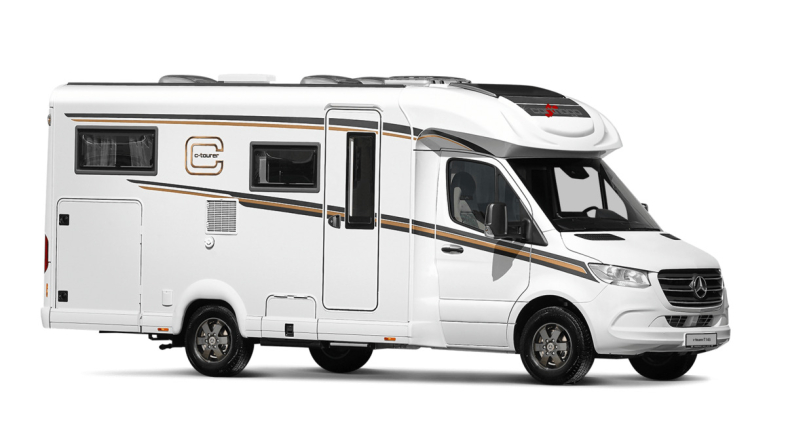 - Środkowe elektrycznie opuszczane łóżko nad częścią wypoczynkową ze świetlikiem w kapturze T (W przypadku opcji elektrycznego, środkowego łóżka opuszczanego, Midi-Heki nad częścią wypoczynkową jest pominięte. Wysokość nad środkowym łóżkiem opuszczanym: 1,84 m) (Elektrycznie opuszczane środkowe łóżko nad częścią wypoczynkową będzie dostępne w modelu c-tourer T 145 RB LE od stycznia 2024 r.)