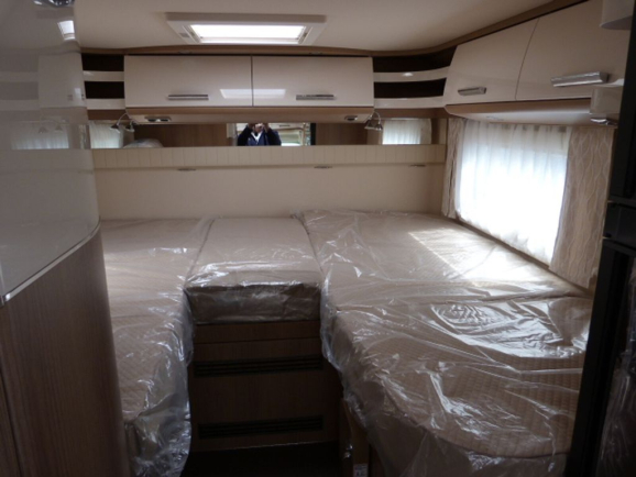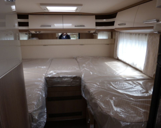 • Elektrycznie opuszczane centralne łóżko nad grupą siedzeń, w tym świetlik w dziobie T (Świetlik Midi-Heki nad grupą siedzeń jest pominięty, jeśli wybrano opcję elektrycznie opuszczanego łóżka centralnego. Przestrzeń nad głową pod centralnym opuszczanym łóżkiem: 1,84 m. Opcja „Skyview” świetlik z pośrednim oświetleniem LED nie jest możliwa w połączeniu z centralnym opuszczanym łóżkiem nad częścią wypoczynkową)