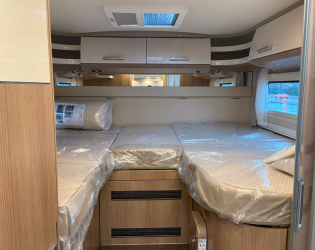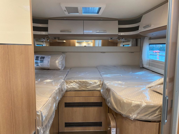 - Elektrycznie opuszczane centralne łóżko nad grupą siedzeń, w tym świetlik w dziobie T (Świetlik Midi-Heki nad grupą siedzeń jest pominięty, jeśli wybrano opcję elektrycznie opuszczanego łóżka centralnego. Przestrzeń nad głową pod centralnym opuszczanym łóżkiem: 1,84 m. Opcja „Skyview” świetlik z pośrednim oświetleniem LED nie jest możliwa w połączeniu z centralnym opuszczanym łóżkiem nad częścią wypoczynkową)