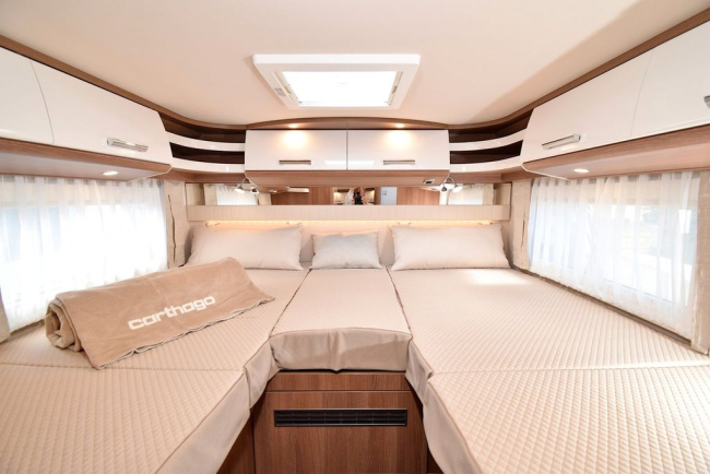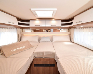 - Środkowe elektrycznie opuszczane łóżko nad częścią wypoczynkową ze świetlikiem w kapturze T (W przypadku opcji elektrycznego, środkowego łóżka opuszczanego, Midi-Heki nad częścią wypoczynkową jest pominięte. Wysokość nad środkowym łóżkiem opuszczanym: 1,84 m) (Elektrycznie opuszczane środkowe łóżko nad częścią wypoczynkową będzie dostępne w modelu c-tourer T 145 RB LE od stycznia 2024 r.)
