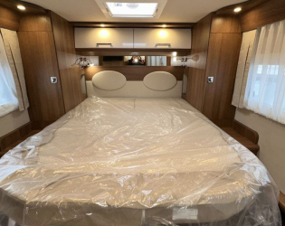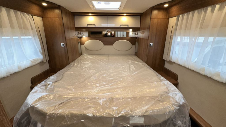 - Elektrycznie opuszczane centralne łóżko nad grupą siedzeń, w tym świetlik w dziobie T (Świetlik Midi-Heki nad grupą siedzeń jest pominięty, jeśli wybrano opcję elektrycznie opuszczanego łóżka centralnego. Przestrzeń nad głową pod centralnym opuszczanym łóżkiem: 1,84 m. Opcja „Skyview” świetlik z pośrednim oświetleniem LED nie jest możliwa w połączeniu z centralnym opuszczanym łóżkiem nad częścią wypoczynkową)