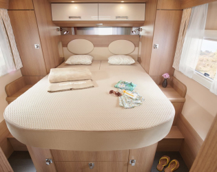 • Środkowe elektrycznie opuszczane łóżko nad częścią wypoczynkową ze świetlikiem w kapturze T (W przypadku opcji elektrycznego, środkowego łóżka opuszczanego, Midi-Heki nad częścią wypoczynkową jest pominięte. Wysokość nad środkowym łóżkiem opuszczanym: 1,84 m) (Elektrycznie opuszczane środkowe łóżko nad częścią wypoczynkową będzie dostępne w modelu c-tourer T 145 RB LE od stycznia 2024 r.)
