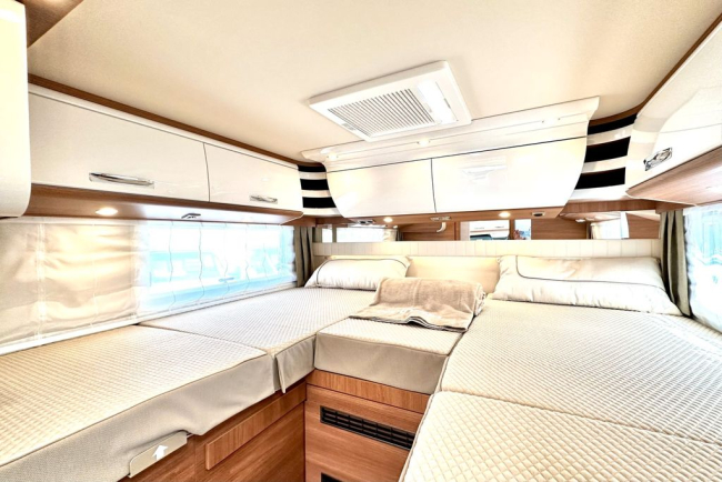 - Koncepcja rozszerzonej przestrzeni do przechowywania w salonie ze schowkami rozmieszczonymi dookoła nad głową w kabinie kierowcy i w sypialni (modele z łóżkiem typu queen-size: szafki podsufitowe nad łóżkiem)