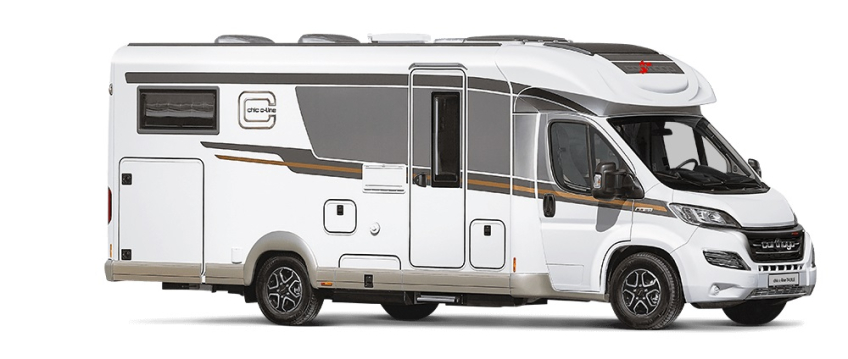 - Opatentowany garaż na skuter/hulajnogę Pedelec, wysokość załadunku do 124 cm (W przypadku opcji garażu na skuter Pedelec pojemność zbiornika na ścieki zmienia się do 110 litrów, a objętość świeżej wody w modelu chic c-line zmienia się do 160 l, co zmniejsza ładowność garażu na skuter o 100 kg. Niemożliwe w połączeniu z opcją aluminiowej blachy ryflowanej do garażu na skuter)