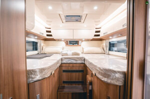 • Kabina kierowcy „Sky Dream Comfort” z dwoma panoramicznymi oknami dachowymi (opcja „Sky Dream comfort” z otaczającymi szafkami podsufitowymi nad częścią wypoczynkową i kabiną kierowcy, dwa duże panoramiczne okna dachowe zintegrowane z podwieszaną designerską podsufitką z pośrednim oświetleniem otoczenia zamiast opuszczanego łóżka)