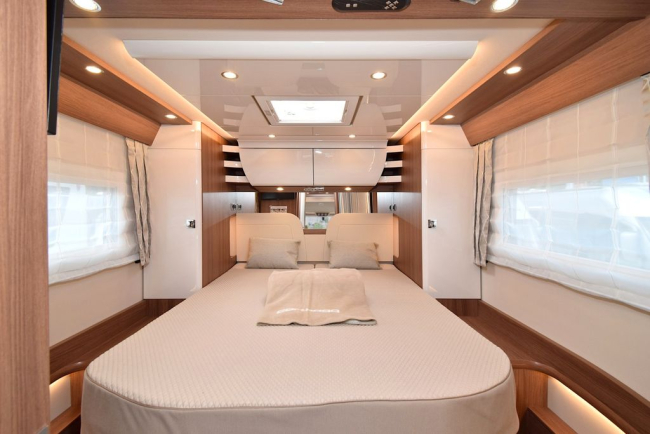 - Kabina kierowcy „Sky Dream Comfort” z dwoma panoramicznymi świetlikami (zamiast opuszczanego łóżka) (Opcja „Sky Dream Comfort” z rozmieszczonymi dookoła schowkami nad głową nad częścią wypoczynkową i kabiną kierowcy, dwoma dużymi panoramicznymi świetlikami zintegrowanymi z podwieszaną designerską podsufitką z pośrednim oświetleniem otoczenia zamiast opuszczanego łóżka)