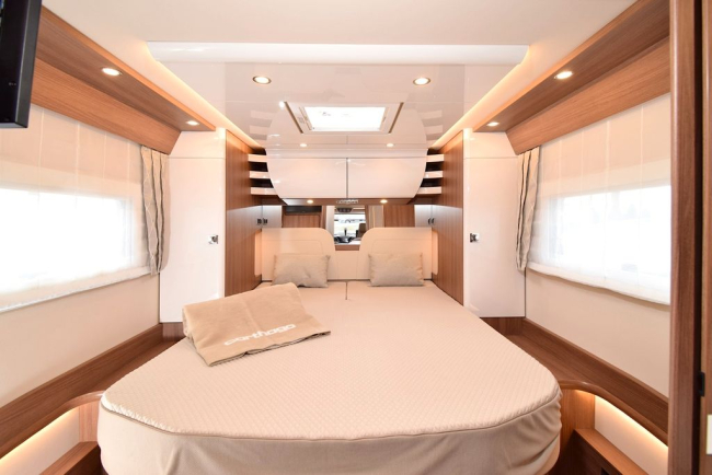 • 24-calowy płaski ekran LED w części sypialnej, w tym uchwyt na telewizor, przełącznik kontaktowy ((Możliwości montażu uzależnione są od wykorzystania powierzchni dachu. Wysokość zabudowy zmienia się o 130 mm z opcjonalnym systemem satelitarnym i klimatyzacją na dachu. Telewizor z tunerem DVB-T2 (w tym USB, HDMI, Full HD). Telewizory zmieniane są na Smart TV od pierwszego kwartału 2023 r.)