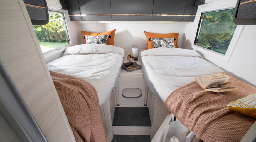 Mając poniżej 7,20 m, model 337 łączy w sobie wszystkie aktualne trendy rynkowe: wyjątkowo przestronne dwa łóżka pojedyncze, garaż, „Smartlounge” twarzą w twarz, łazienka z podwójną ścianką działową... Kto może chcieć więcej?