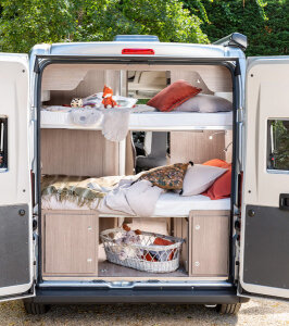 Na mniej niż 6 m genialny V114MAX wyposażony jest w cztery stałe łóżka, które można dowolnie regulować. Dzieje się tak, ponieważ tylna łóżka są ruchome. Jeśli podróżujecie tylko w dwie lub trzy osoby, schowaj część pościeli, aby skorzystać z dużo większej przestrzeni do przechowywania.