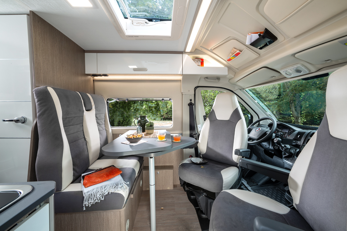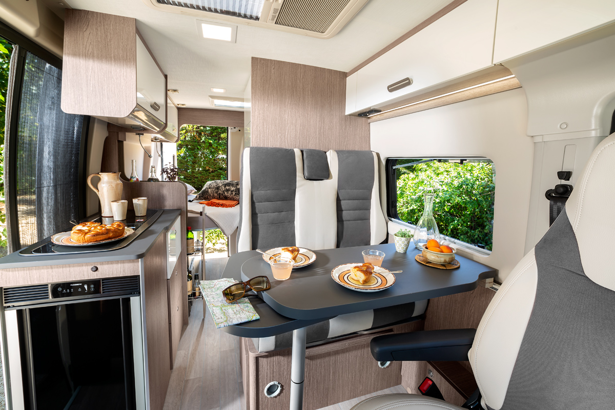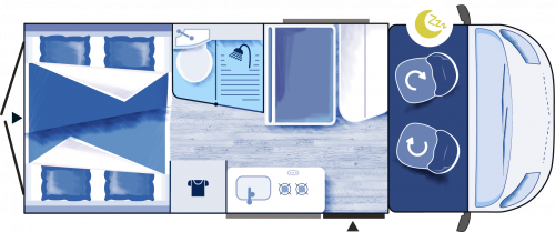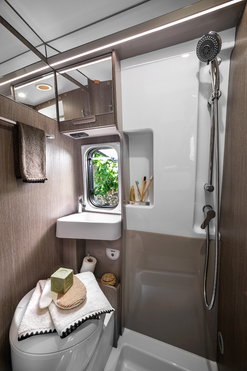 • Izolowany i podgrzewany zbiornik ścieków, izolacja zewnętrznych obwodów wodnych i grzewczych, ogrzewanie dwufunkcyjne na olej napędowy D6E 6000 W, osłona termoizolacyjna deski rozdzielczej i okien kabiny, zasłony tylnych drzwi, rolety rzymskie w jadalni