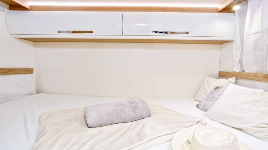 • Wersja P - bez opuszczanego łóżka, dodatkowe łóżko w salonie, większe szafki, okno w salonie