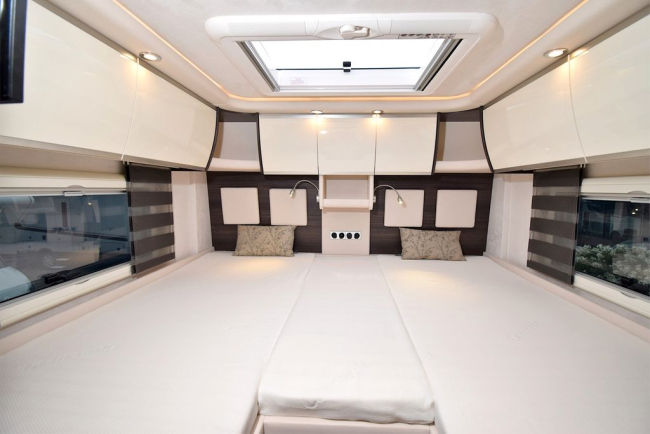 - System telewizji satelitarnej z anteną 85 cm, w pełni automatycznym ustawieniem, konfiguracją dla wielu użytkowników z TWIN-LNB, podłączenie drugiego odbiornika z 12 V i gniazdem antenowym w sypialni, możliwe odtwarzanie dźwięku przez system radiowy (całkowita wysokość pojazdu plus ok. 120 mm) (nie w połączeniu z opuszczanym łóżkiem)