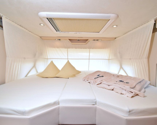 - Szyby boczne w kabinie kierowcy ze szkła izolacyjnego, przyciemniane, z roletą plisowaną (może służyć jako osłona przed słońcem podczas jazdy) i moskitierą, rama izolowana termicznie