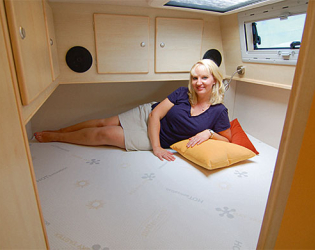 Telewizor można zintegrować z pierwszymi drzwiami w górnej szafce nad łóżkiem. Dzięki specjalnemu mocowaniu ekran można doskonale oglądać zarówno z łóżka, jak i z przednich foteli.