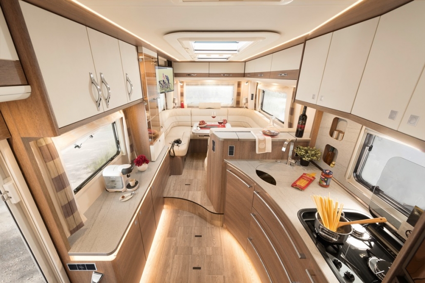 - Luksusowe fotele, hydrauliczne, podgrzewane, z dwoma wyściełanymi podłokietnikami, regulacją w trzech płaszczyznach i luksusowym zagłówkiem z logo Dethleffs