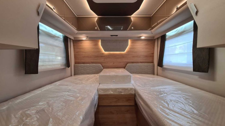 - Ogrzewanie ciepłą wodą z bojlerem, automatycznym zaworem spustowym i zaworem odcinającym do części sypialnej i cyfrowym panelem sterowania