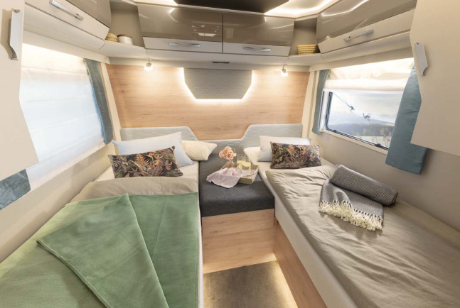 - Ogrzewanie ciepłą wodą z bojlerem, automatycznym zaworem spustowym i zaworem odcinającym do części sypialnej i cyfrowym panelem sterowania