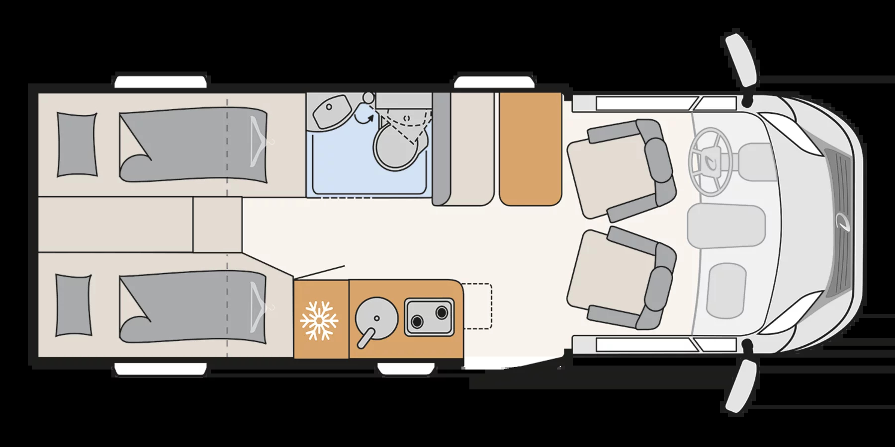 Globebus Camp T 4 to praktyczny i stylowy kamper, który łączy kompaktowe proporcje z przestronnym, komfortowym wnętrzem. Dzięki przemyślanemu rozmieszczeniu i solidnej izolacji, sprawdzi się przez cały rok — idealny dla par lub małych rodzin szukających mobilności bez kompromisów.