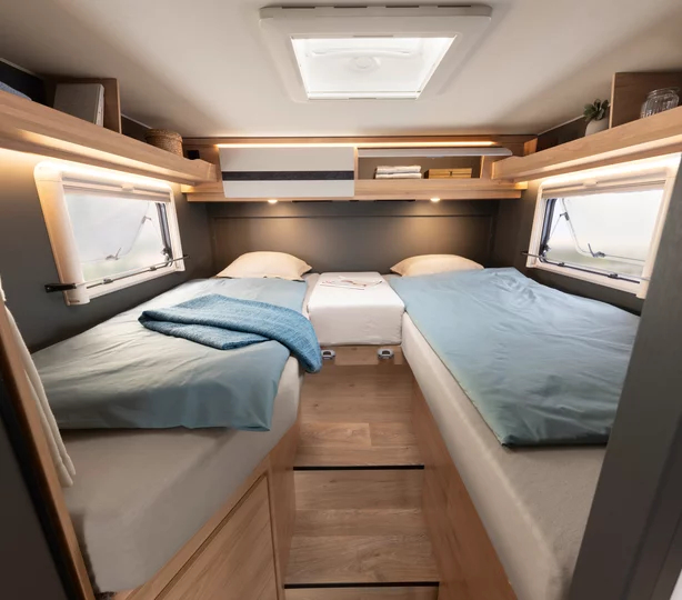 Sypialnia tylna: dwa pojedyncze łóżka o długości 2000 mm i 1950 mm, z możliwością połączenia w jedno duże