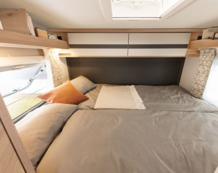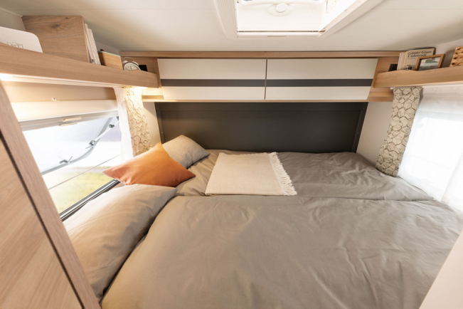- Panoramiczny świetlik 40x40 cm z moskitierą i roletami zaciemniającymi nad opuszczanym łóżkiem