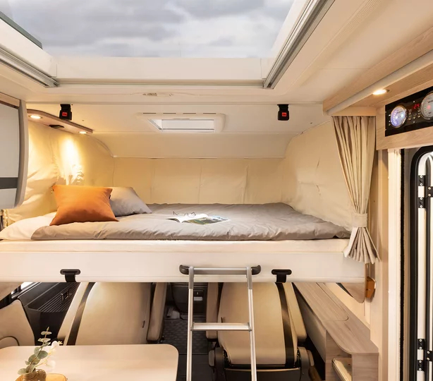 Łóżko podnoszone nad kabiną: szerokość 150 cm, montowane seryjnie