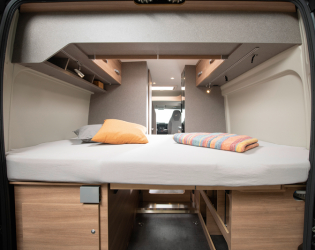 - Dach podnoszony w kolorze czarnym, otwierany całkowicie z przodu, wyposażony w elektryczny asystent zamykania, moskitierę, lampkę na gęsiej szyi i gniazdo USB, z wysokiej jakości materacem