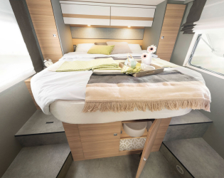 - Elektryczne składane łóżko nad siedziskiem („Panoramiczny dach 70x50 cm w części mieszkalnej” jest połączona z opcją „Elektrycznie podnoszone łóżko nad siedziskiem” w części sypialnej).