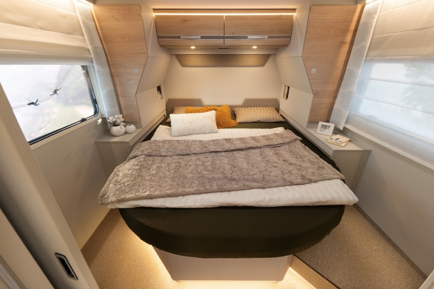 - Garaż w tylnej części: 2 drzwi/klapy garażowe umożliwiające obsługę jedną ręką, obniżony tył (obciążenie powierzchniowe 150 kg), ogrzewanie, listwy do mocowania, oświetlenie, 1 gniazdo 230 V