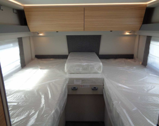 - Panoramiczny świetlik 40x40 cm z moskitierą i roletami zaciemniającymi nad opuszczanym łóżkiem