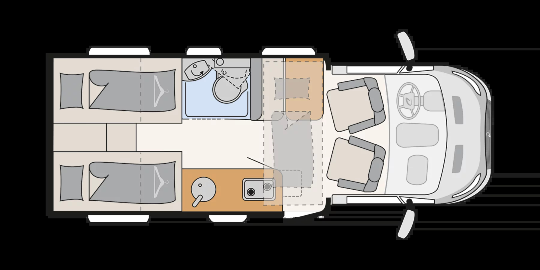 Kuchnia: dwa palniki, zlew, lodówka ok. 83 l (+ 8 l zamrażarki), rozkładany blat i praktyczne schowki