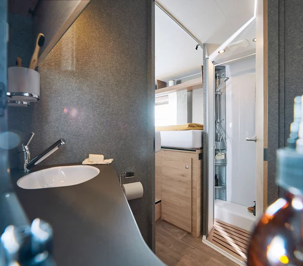 Salon: przestronny, bezprogowy układ „L”, wolnostojący stół, obrotowe fotele kierowcy i pasażera