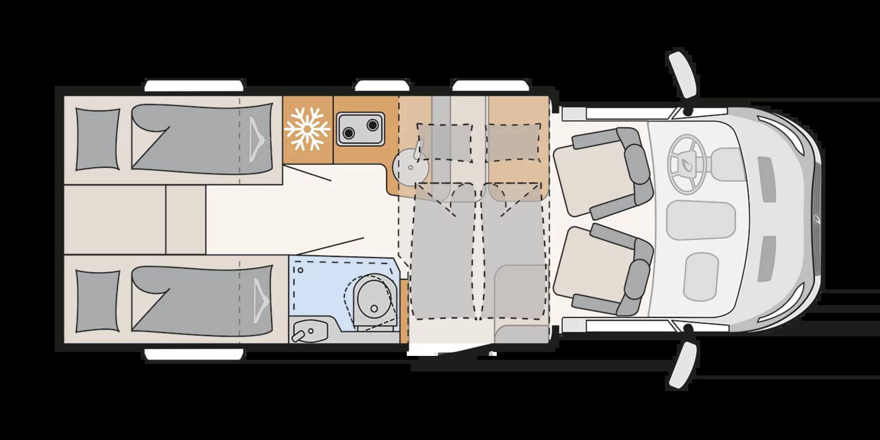 Dethleffs Just Go T 6815 EB to funkcjonalny i kompaktowy kamper, który łączy zwrotność pojazdu dostawczego z komfortem typowym dla większych modeli. Elastyczny układ wnętrza, solidna izolacja i wydajne ogrzewanie czynią go idealnym towarzyszem całorocznych podróży.
